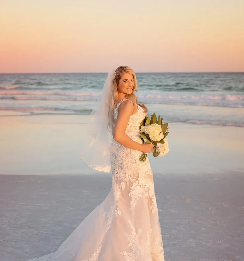 If you’re hosting a destination wedding with a beach ceremony and formal reception, seek convertible styles. A sleeveless lace gown with a detachable overskirt checks both boxes: wear the lightweight lace base for the beach, then add the structured satin overskirt (trimmed with matching lace) for the evening. Another option is sleeveless with a lace bodice. It transitions from sand to ballroom with a quick change of accessories.